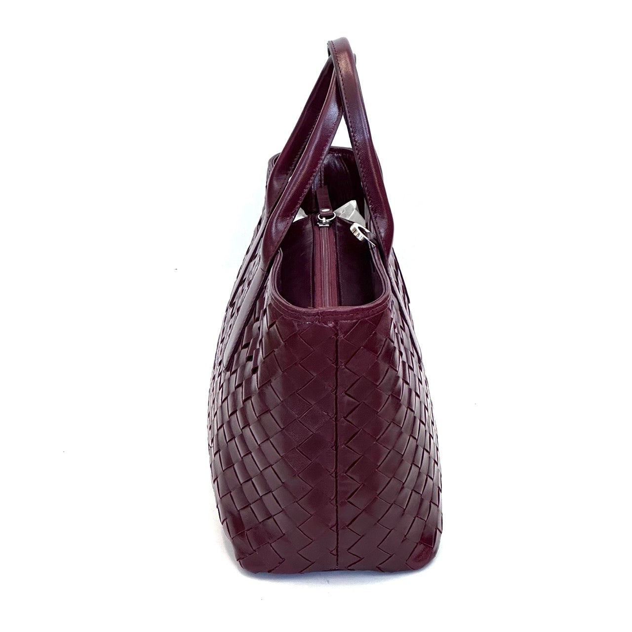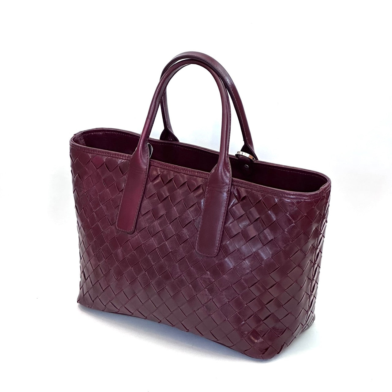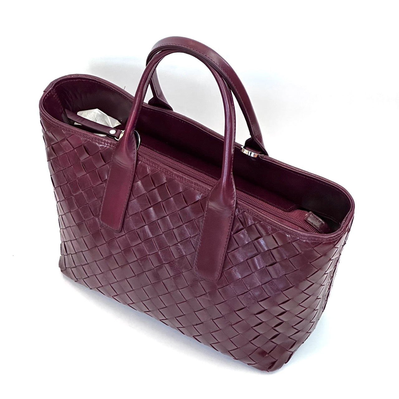 Borsa in pelle di capretto intrecciata a mano, lavorazione artigianale Made in Italy.