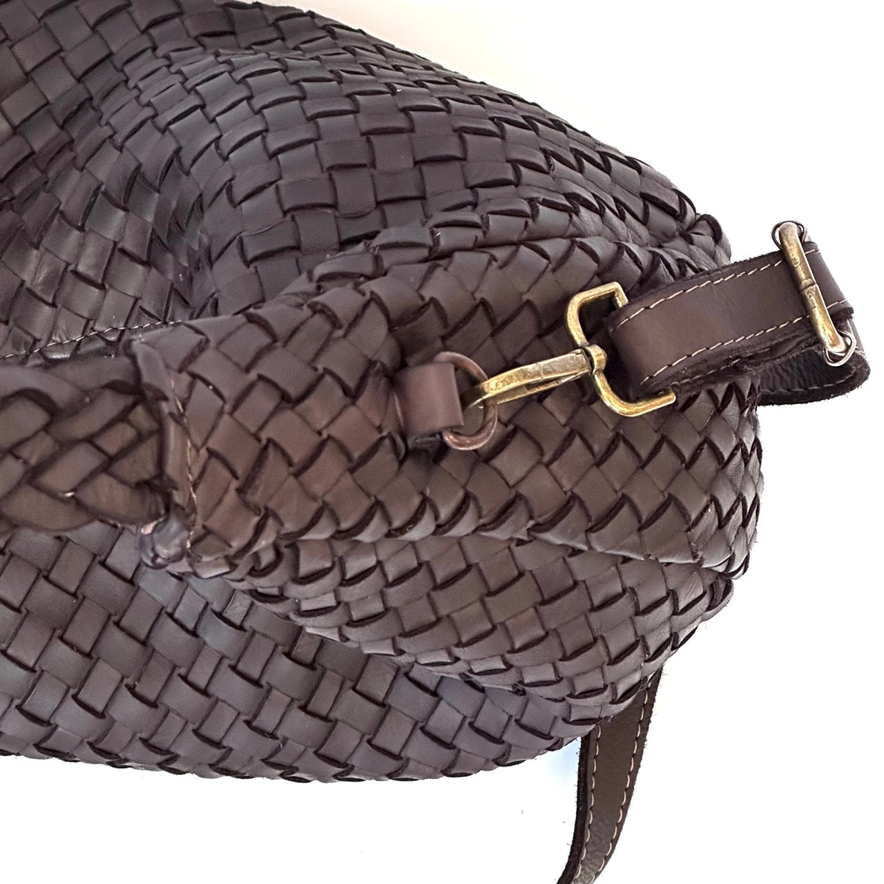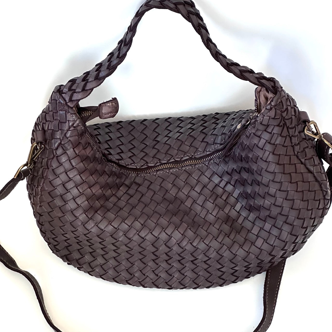 Borsa in morbida pelle di vitello lavata dall'aspetto vintage. Pelle intrecciata fronte e retro, maniglia intrecciata.