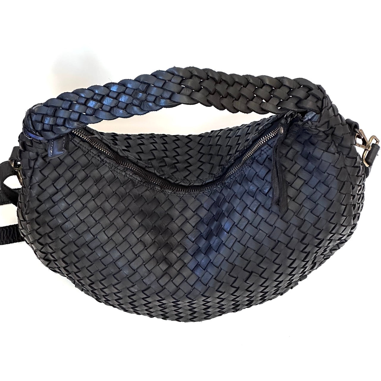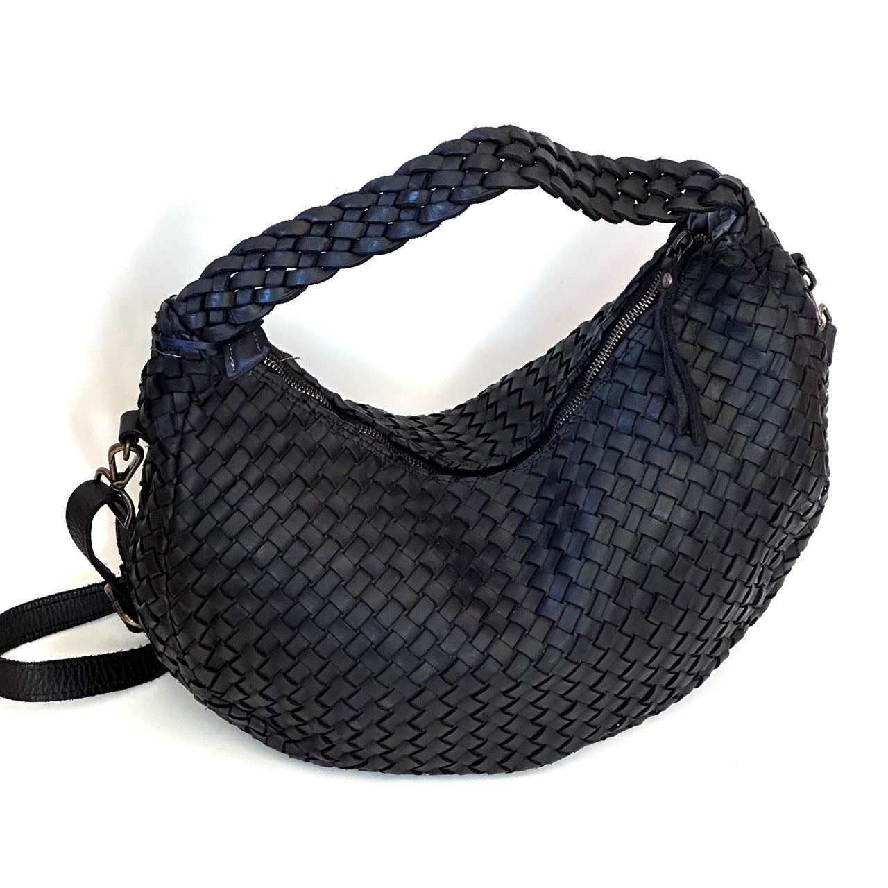 Borsa in morbida pelle di vitello lavata dall'aspetto vintage. Pelle intrecciata fronte e retro, maniglia intrecciata.
