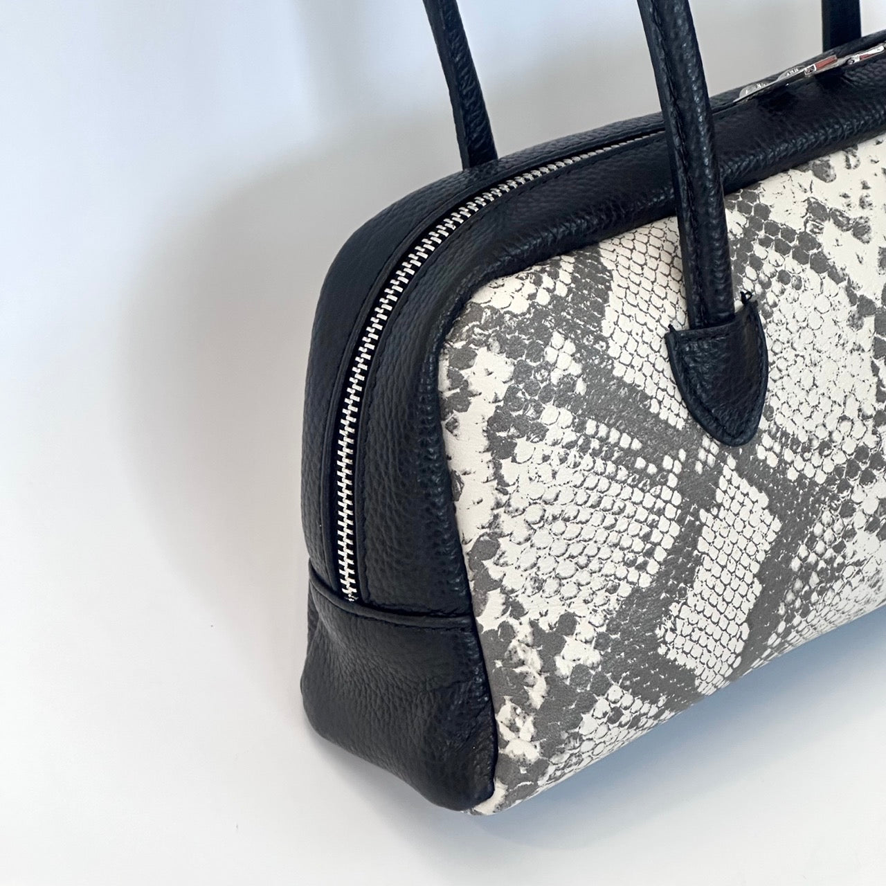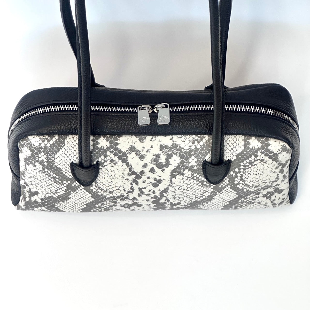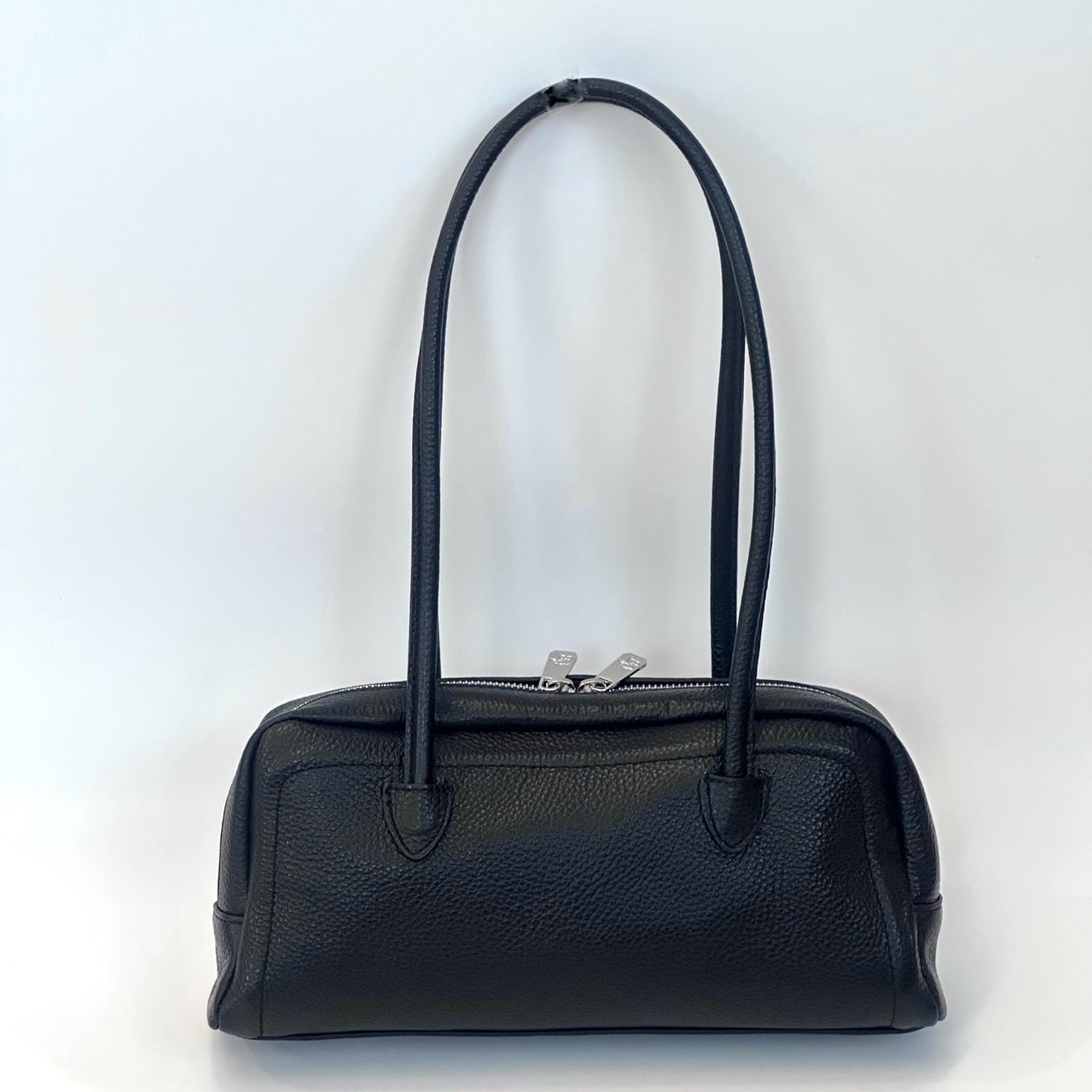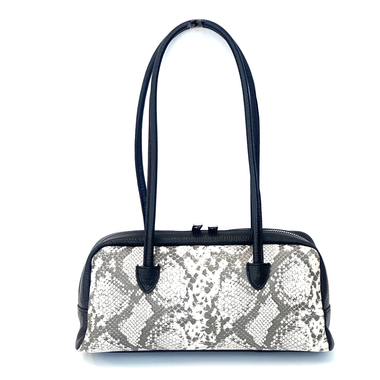 Borsa in pelle a due manici con chiusura a cerniera. Interno foderato con taschine porta oggetti. Portabilità a spalla.