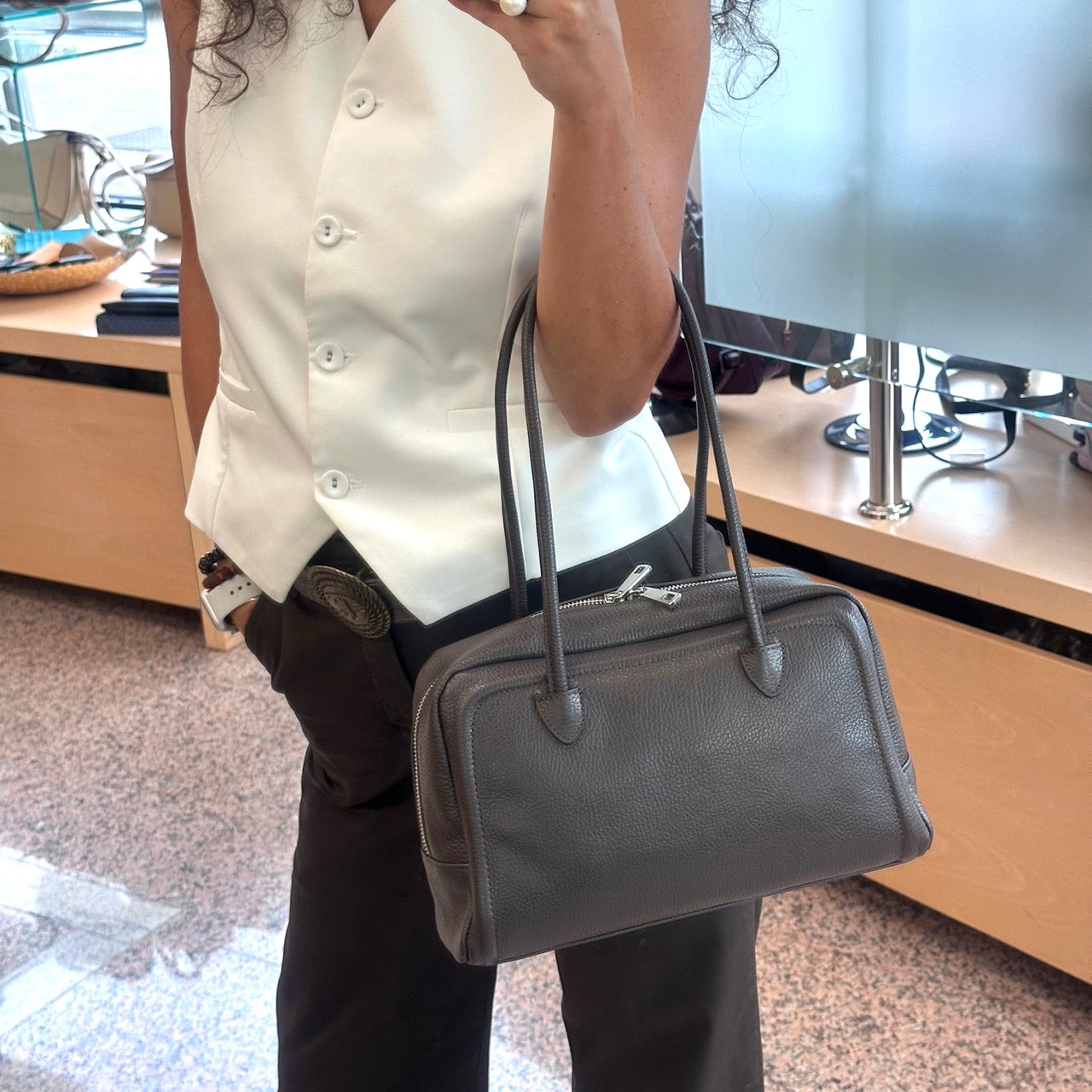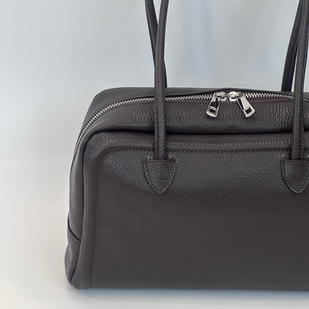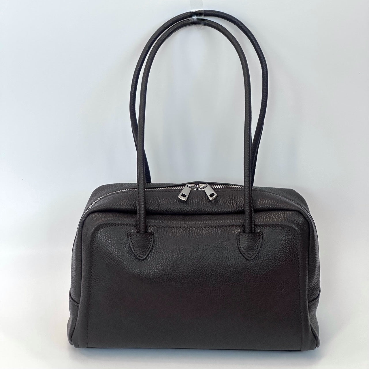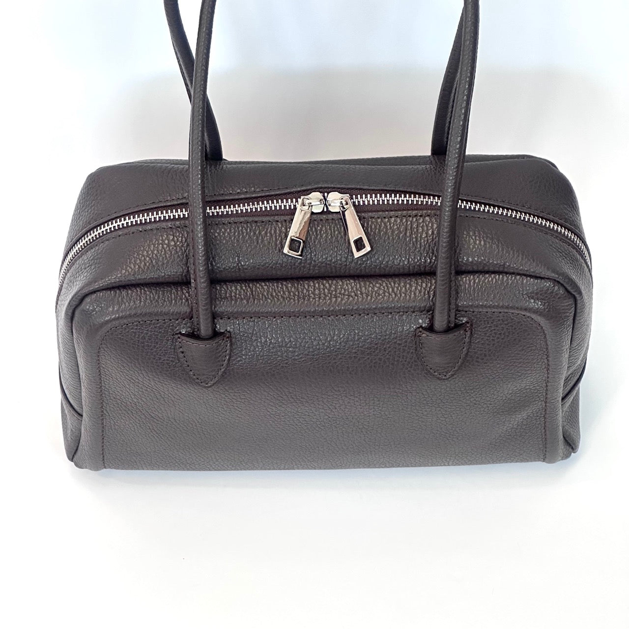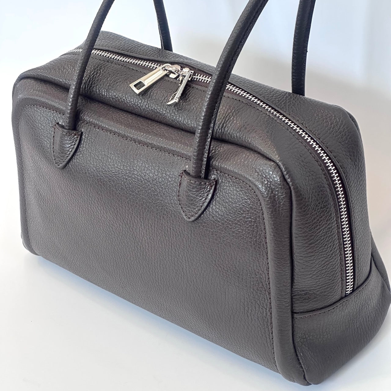 Borsa in pelle scamosciata a due manici con chiusura a cerniera. Marcapunto in tinta. Interno foderato con taschine porta oggetti. Portabilità a spalla.