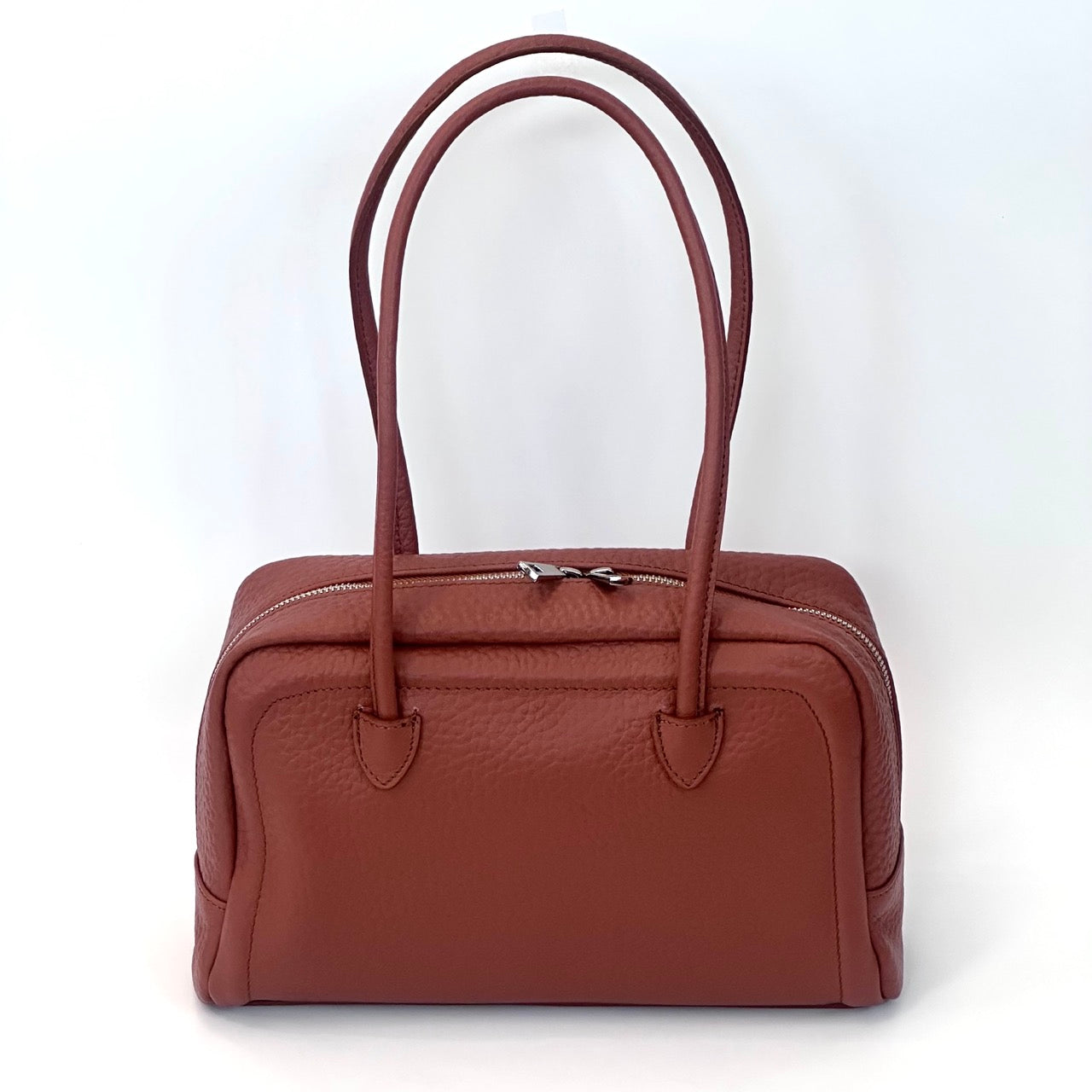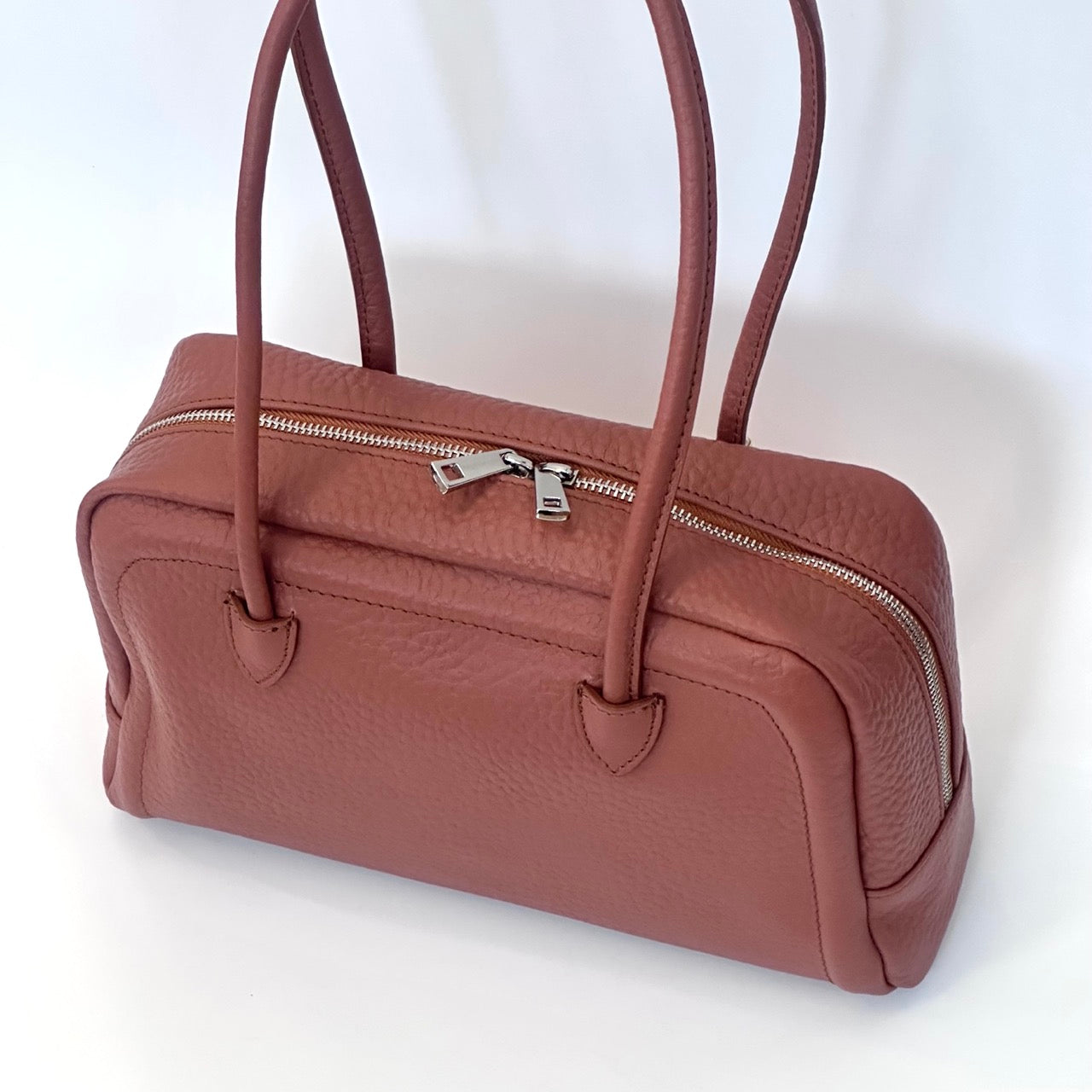 Borsa in pelle scamosciata a due manici con chiusura a cerniera. Marcapunto in tinta. Interno foderato con taschine porta oggetti. Portabilità a spalla.