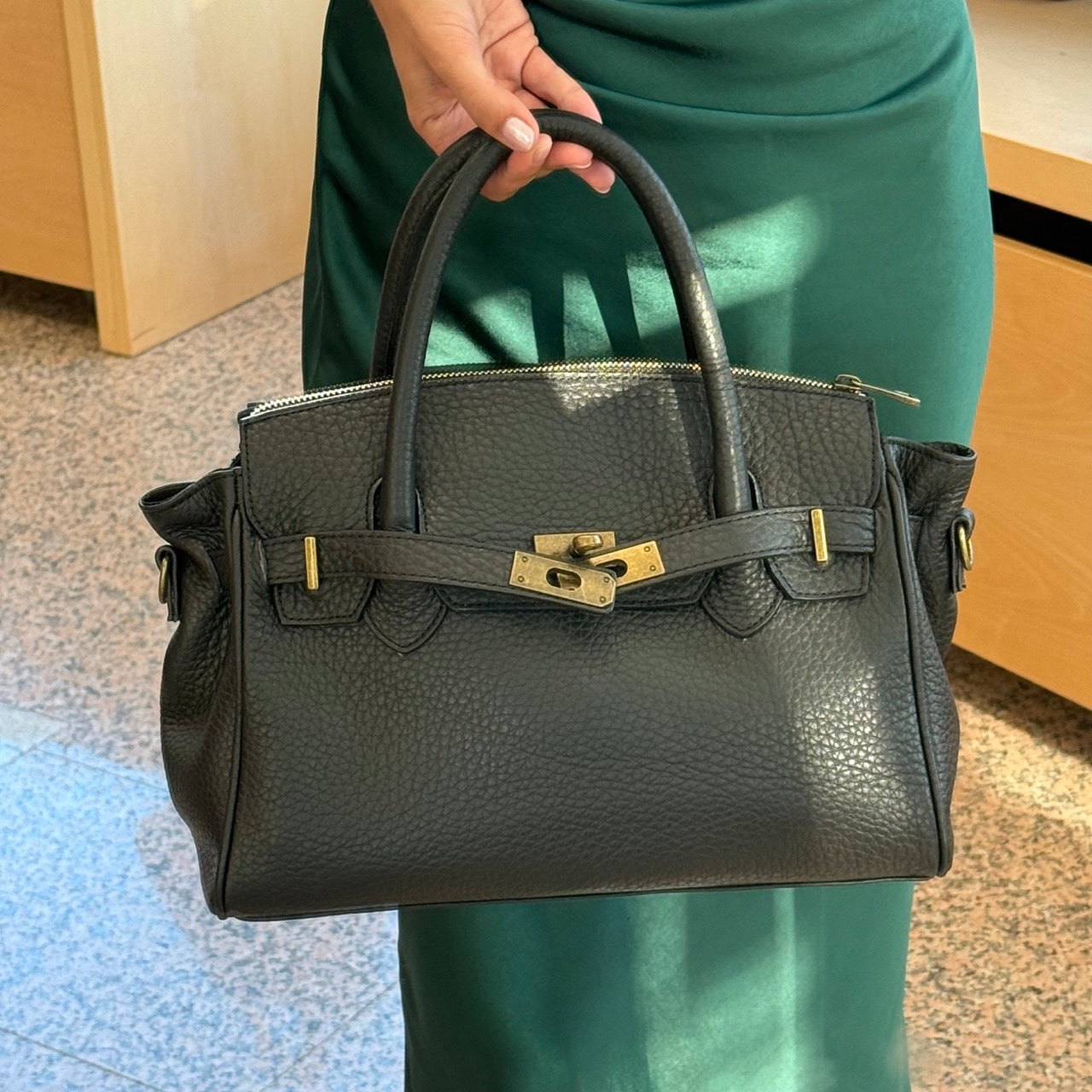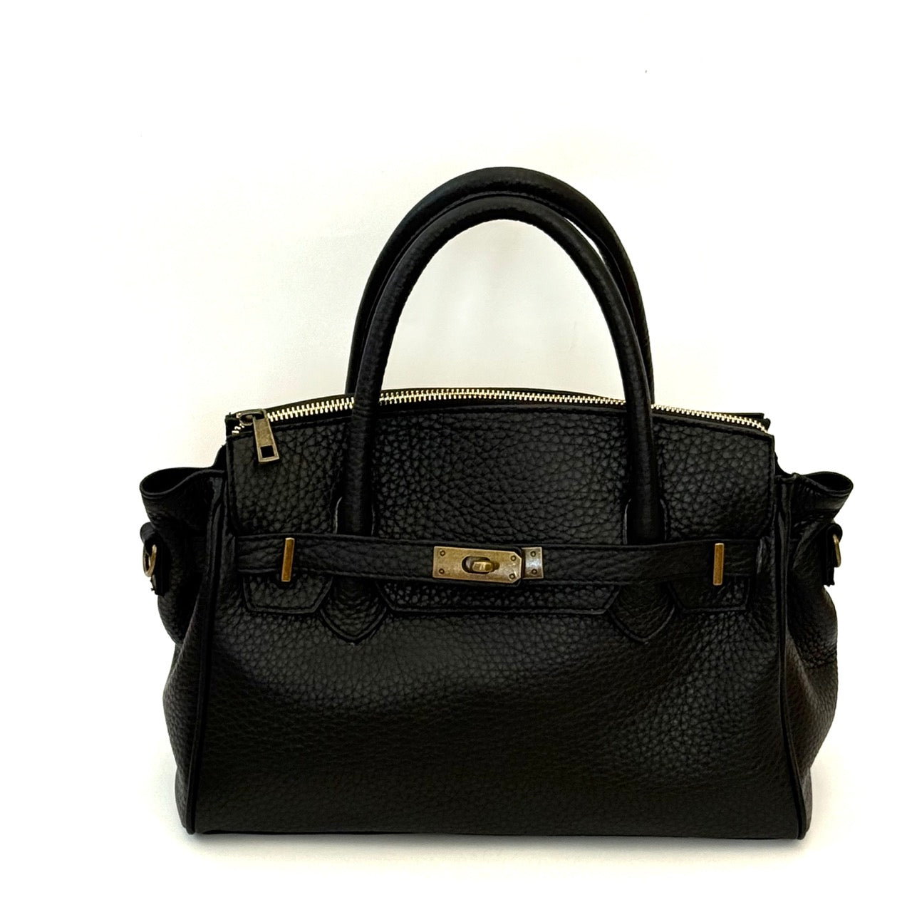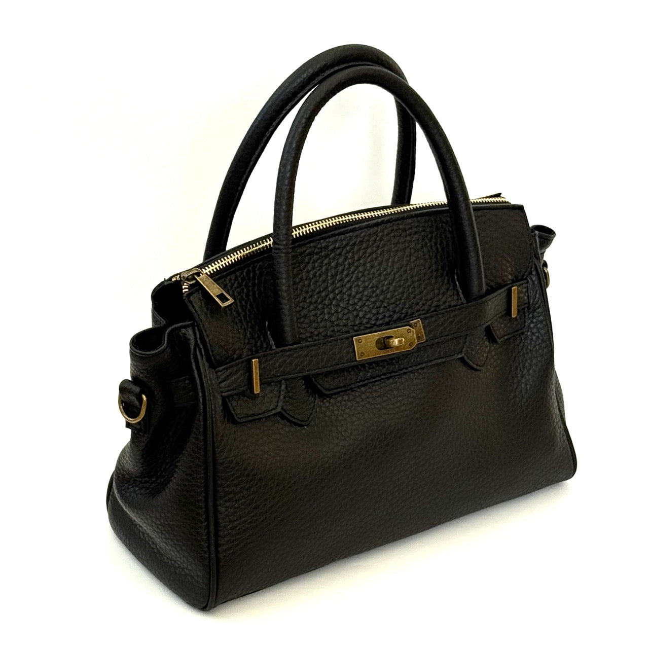 Borsa in pelle a due manici con comoda tracolla regolabile.