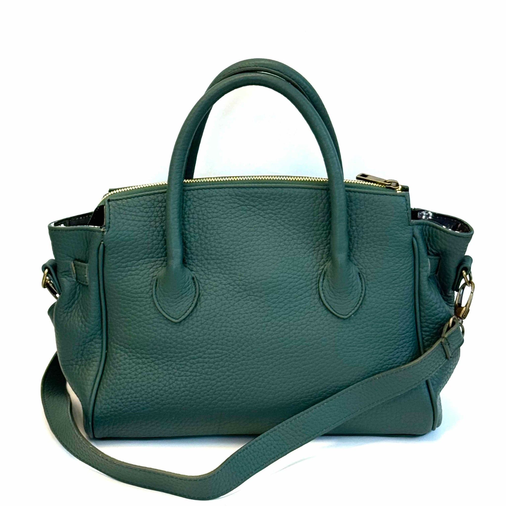 Borsa in pelle martellata a due manici con comoda tracolla regolabile.