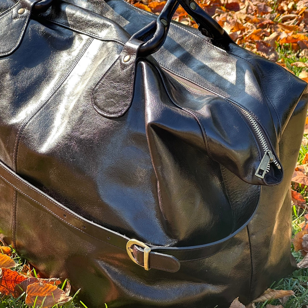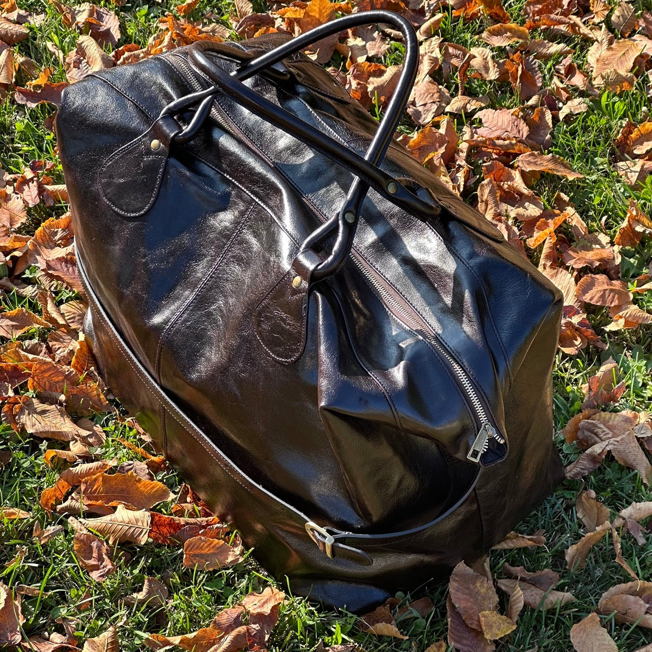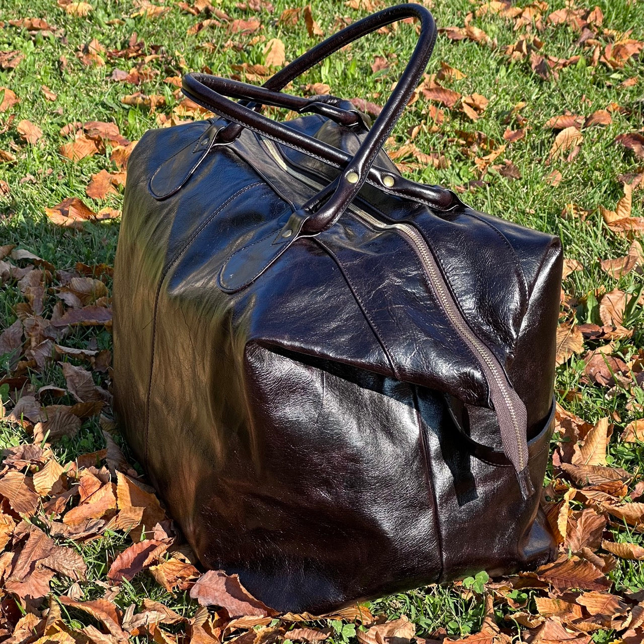 Borsone in pelle di vitello lavato e tinto in botte. Dotato di due manici e tracolla lunga regolabile.