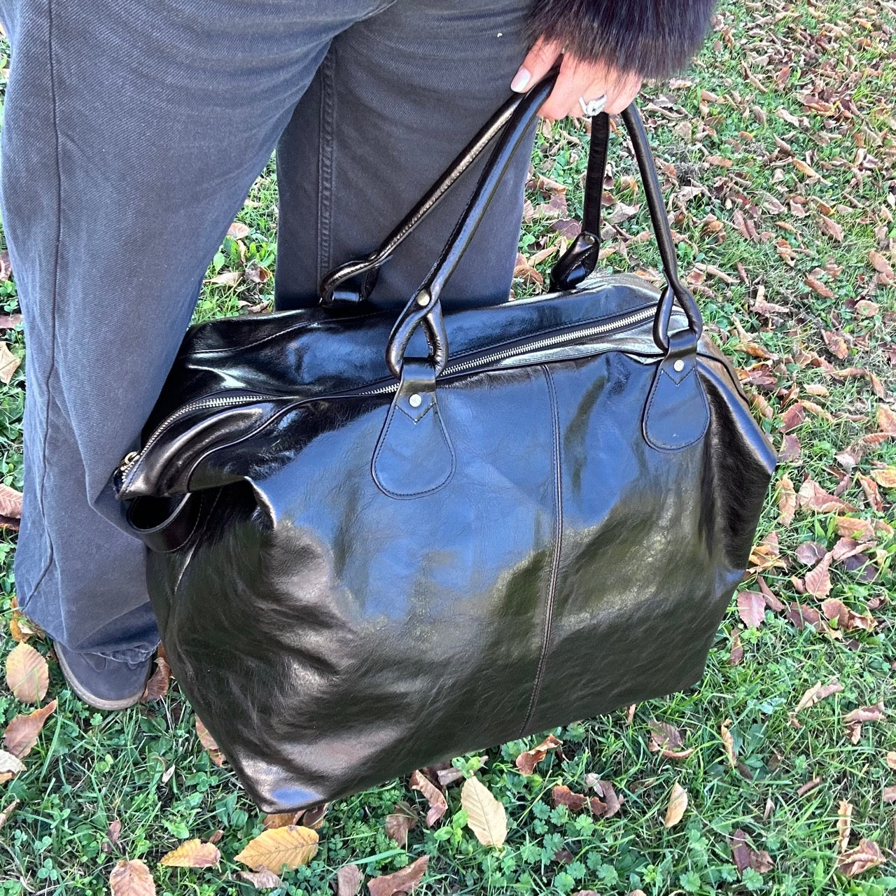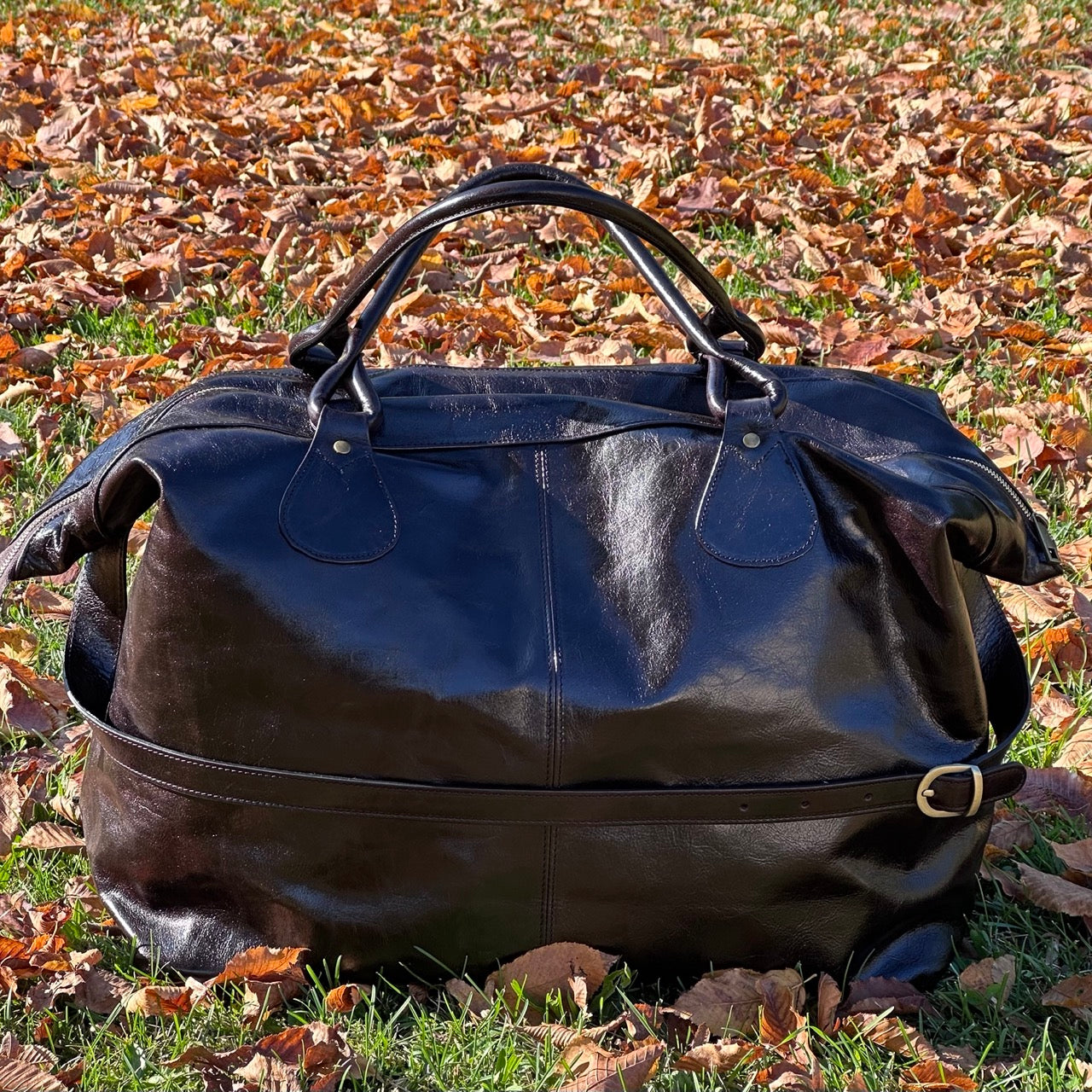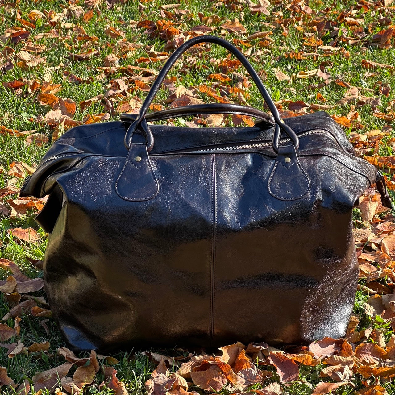 Borsone in pelle di vitello lavato e tinto in botte. Dotato di due manici e tracolla lunga regolabile.