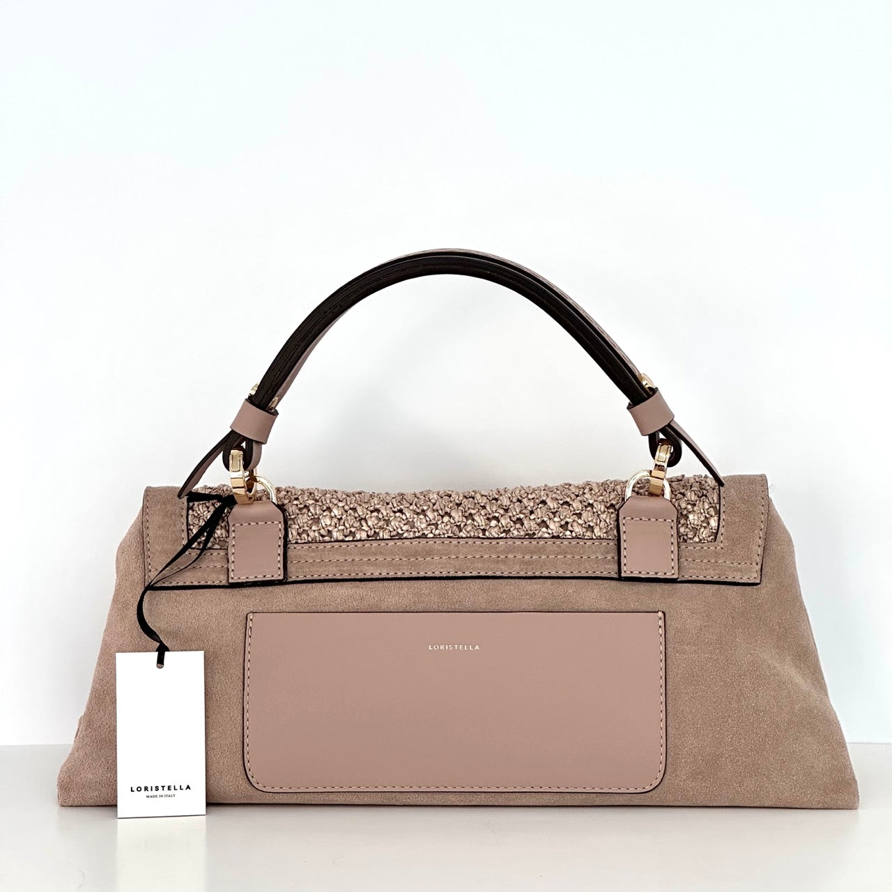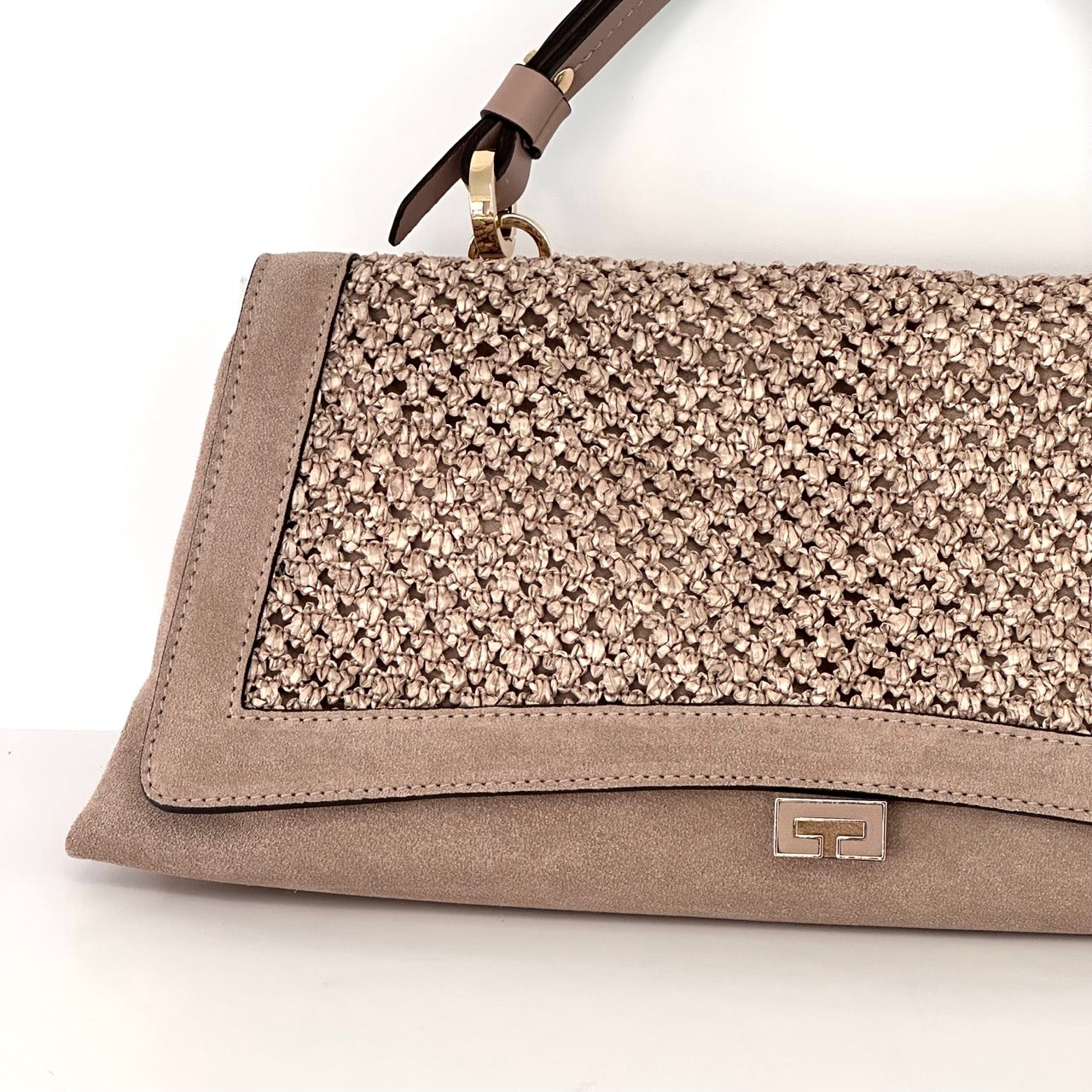 Loristella borsa a mano e a tracolla regolabile in pelle scamosciata color cuoio. Linea raffinata e alla moda, accessori color oro ducale.