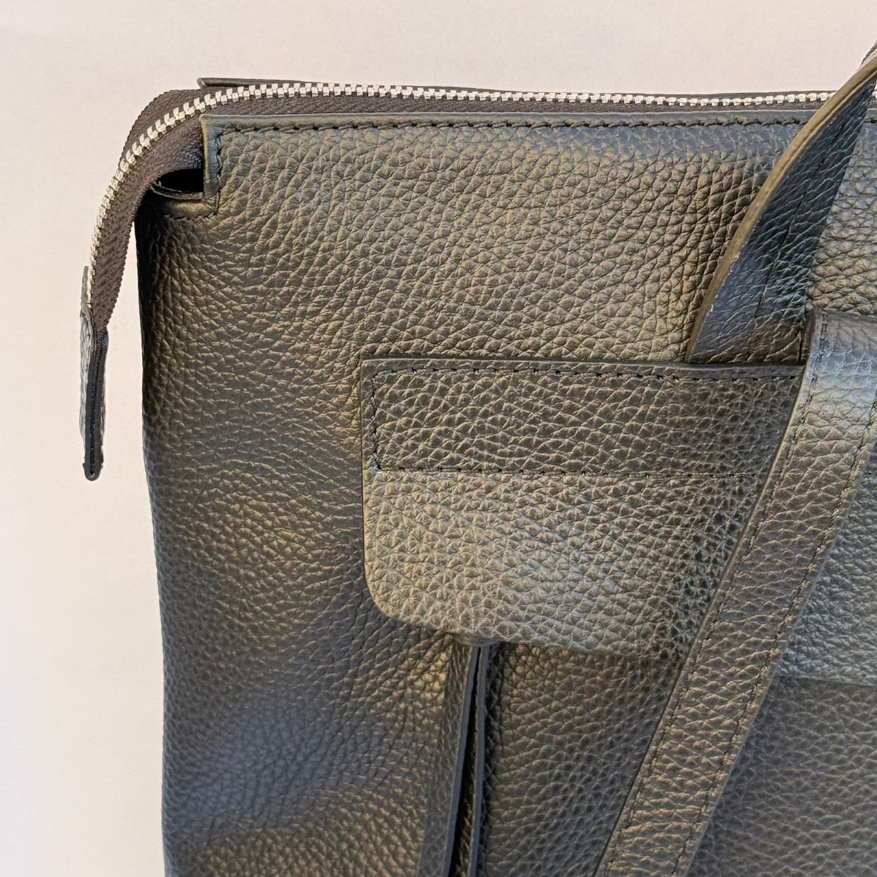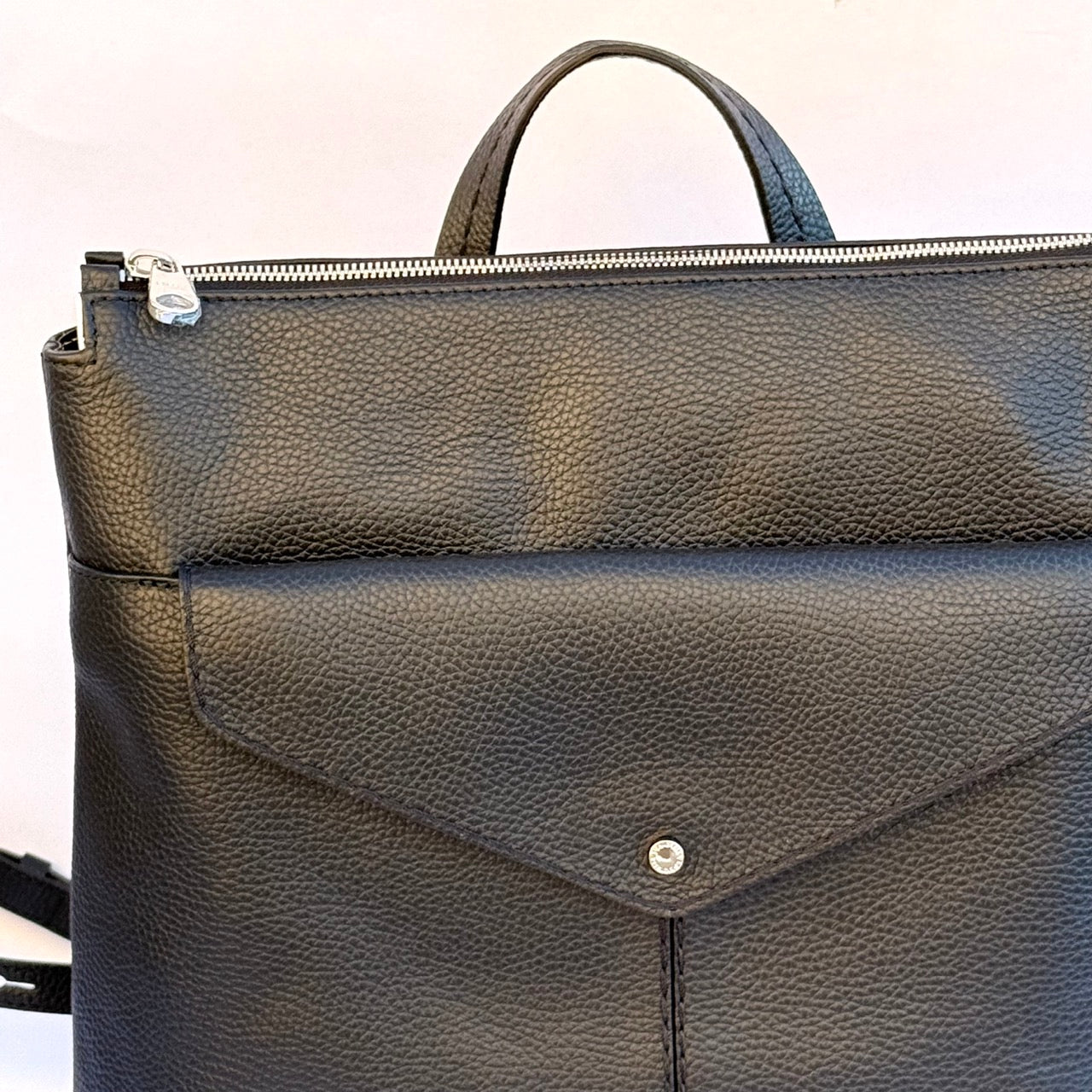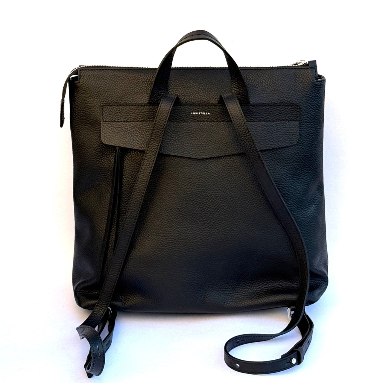 Zaino in pelle Loristella. Accessori metallici color oro. Chiusura superiore con cerniera. Tasche frontali chiusa con bottonaio. Fodera interna in cotone col rosa. Tasca interna con cerniera, tasca porta cellulare. Sul retro, un'ampia tasca chiusa con cerniera.