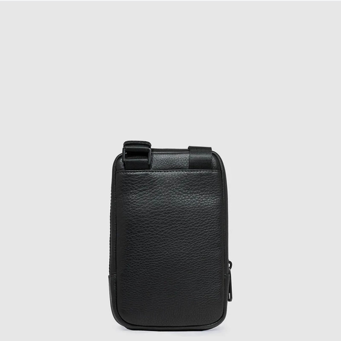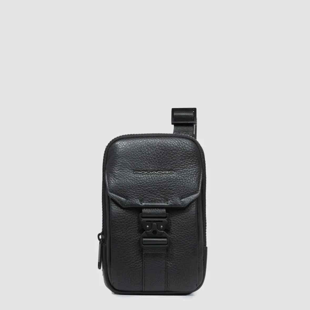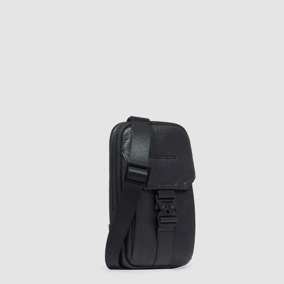 Piquadro borsello in pelle porta cellulare. Vano principale chiuso con zip, due tasche interne imbottite anti urto. Tasca frontale chiusa con fibbia accessorio.
