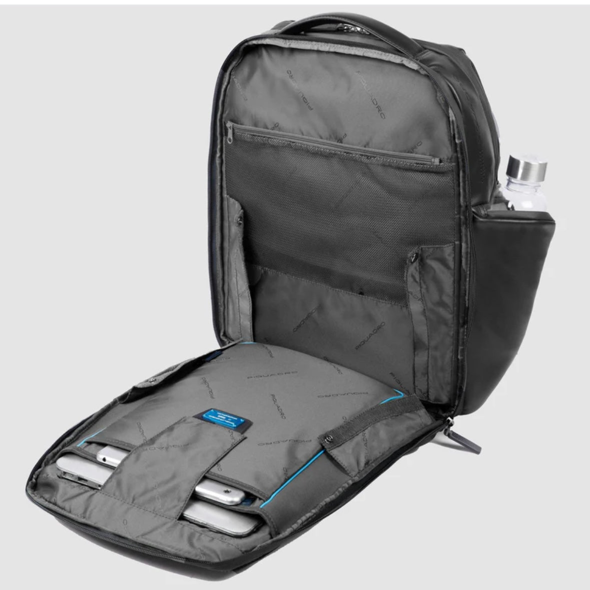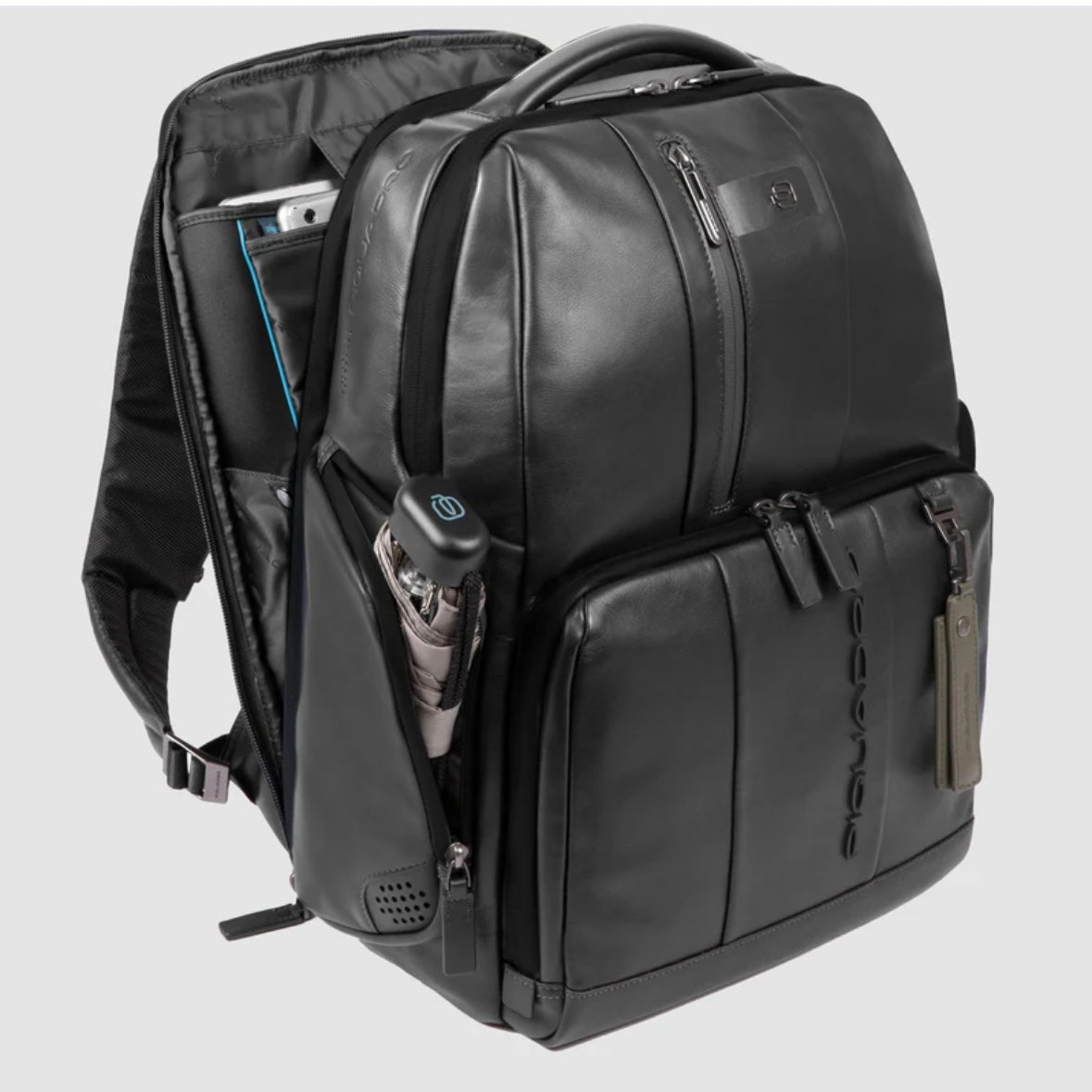 Piquadro zaino da uomo in pelle dotato di vano porta pc 15,6" e porta iPad con protezioni anti urto. Ampio vano frontale con tasche organizzate. Tasche laterali porta ombrello e porta bottiglia.