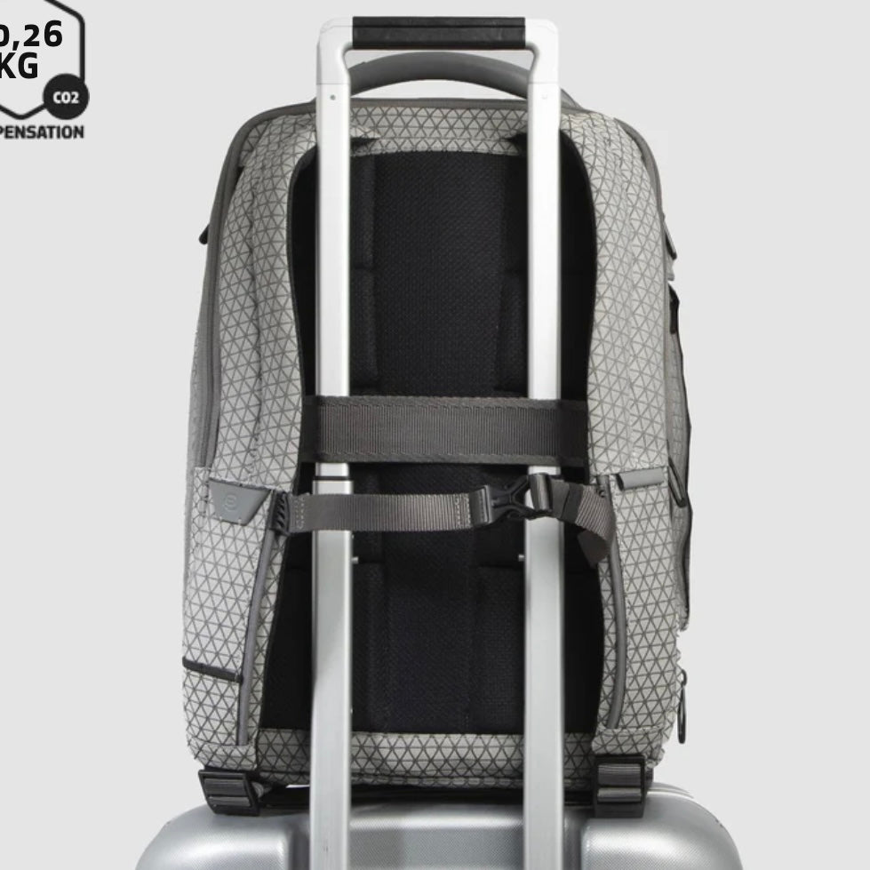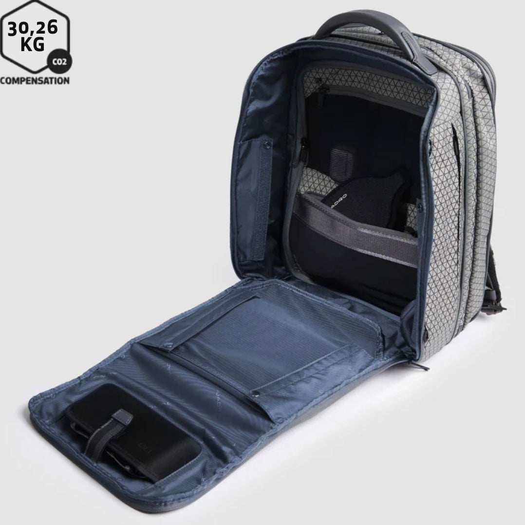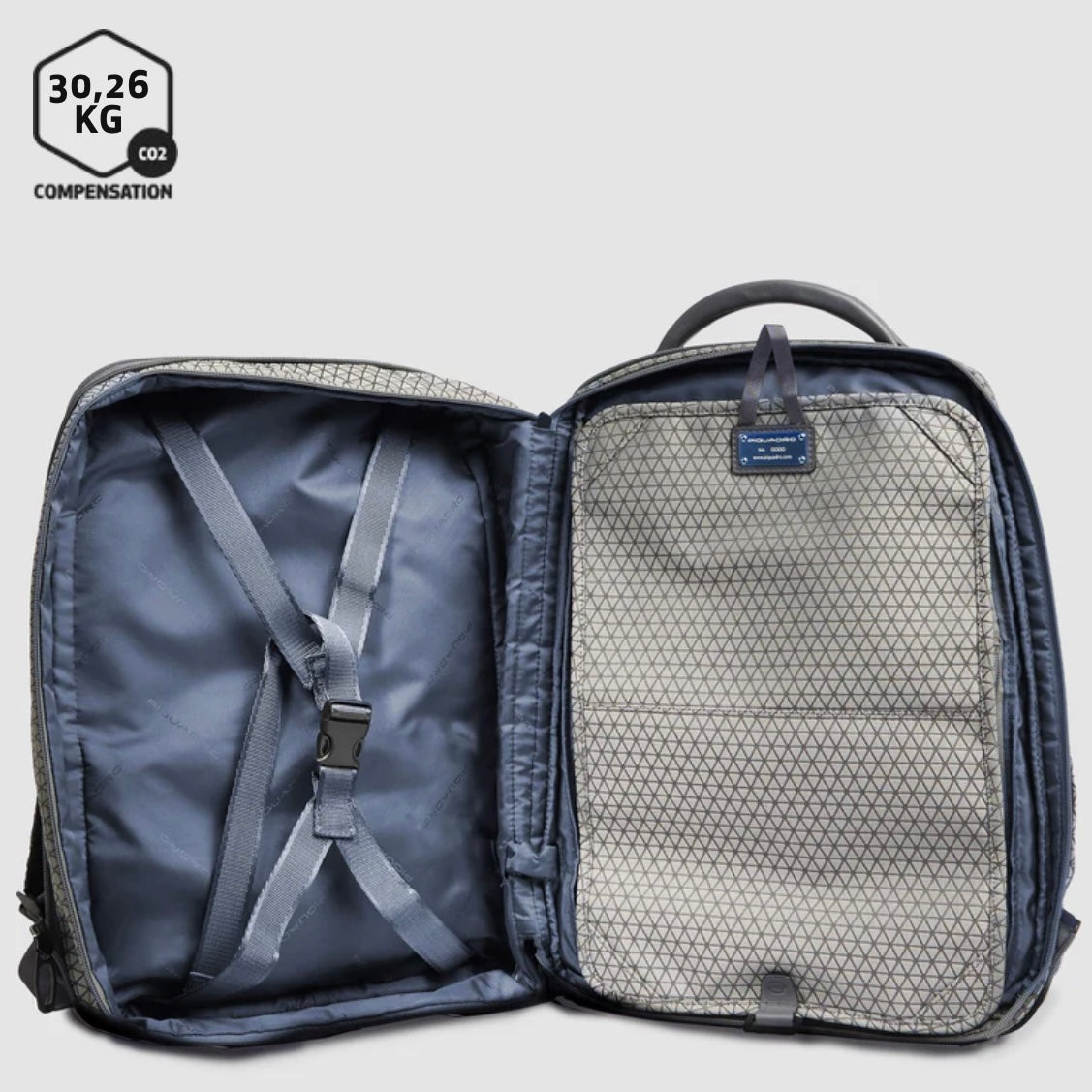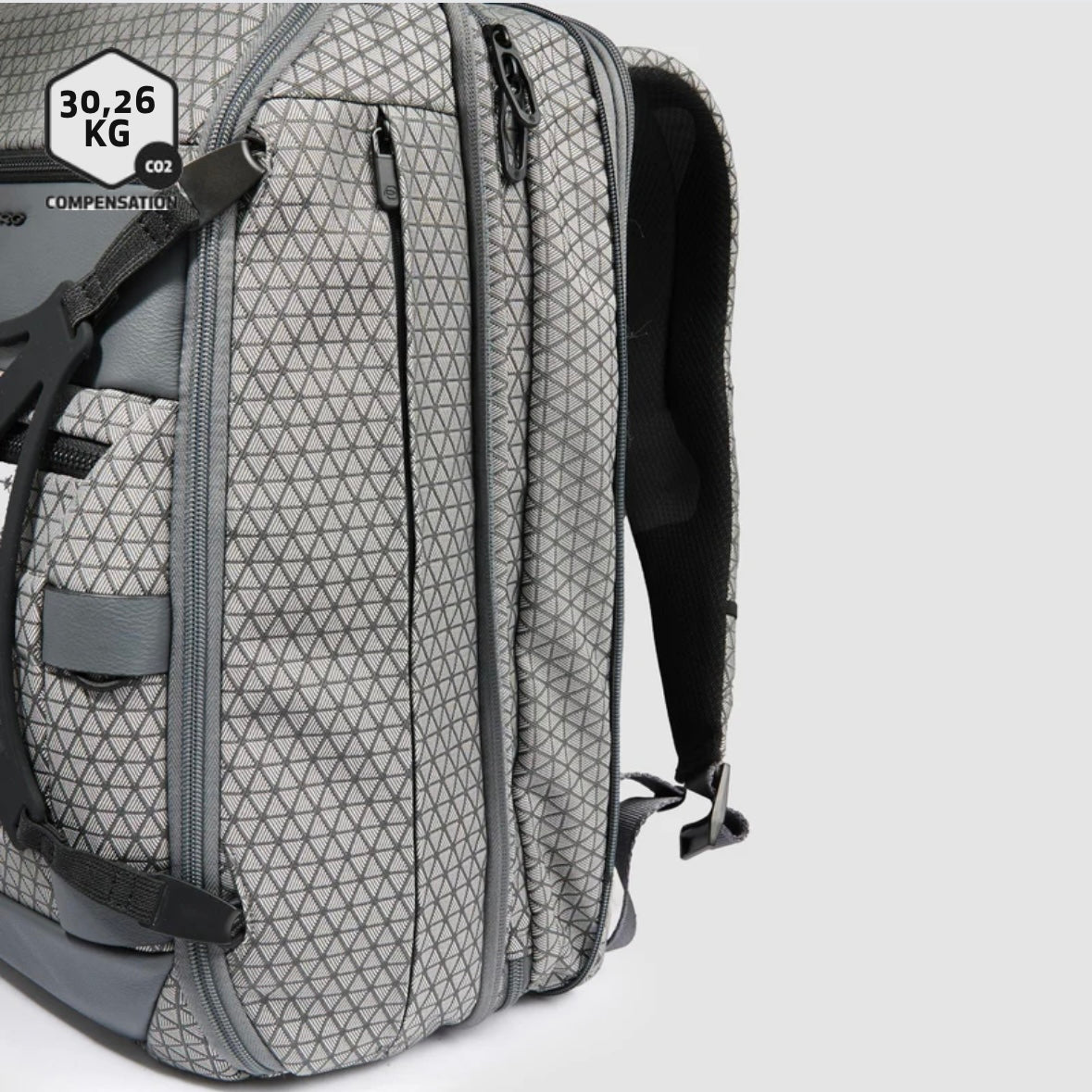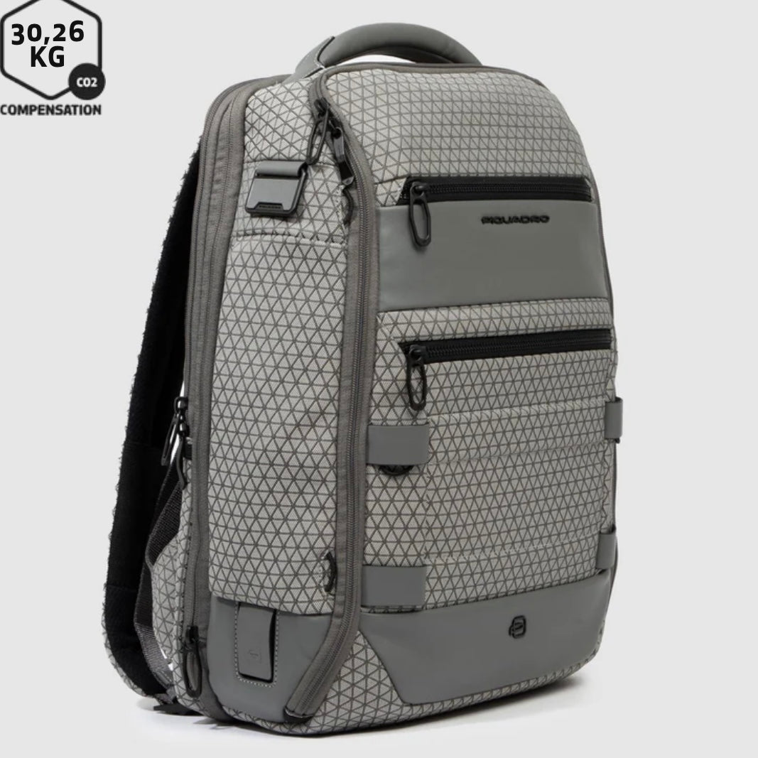 Piquadro zaino da viaggio in tessuto ispirato alla geometria molecolare del carbonio, la più resistente e leggera in natura. Struttura modulare adatta al viaggio e al lavoro.