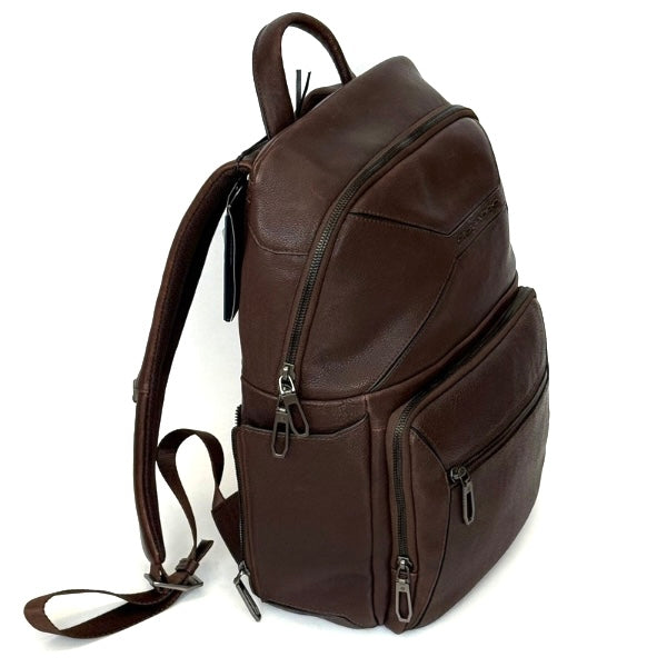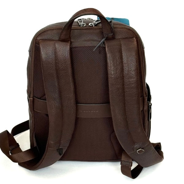 Piquadro zaino in pelle a due scomparti. Scomparto porta pc e porta ipad imbottito anti urto. Scomparto principale porta documenti con tasche porta oggetti. Tasca frontale. Tasca laterale porta ombrello e porta bottiglia.
