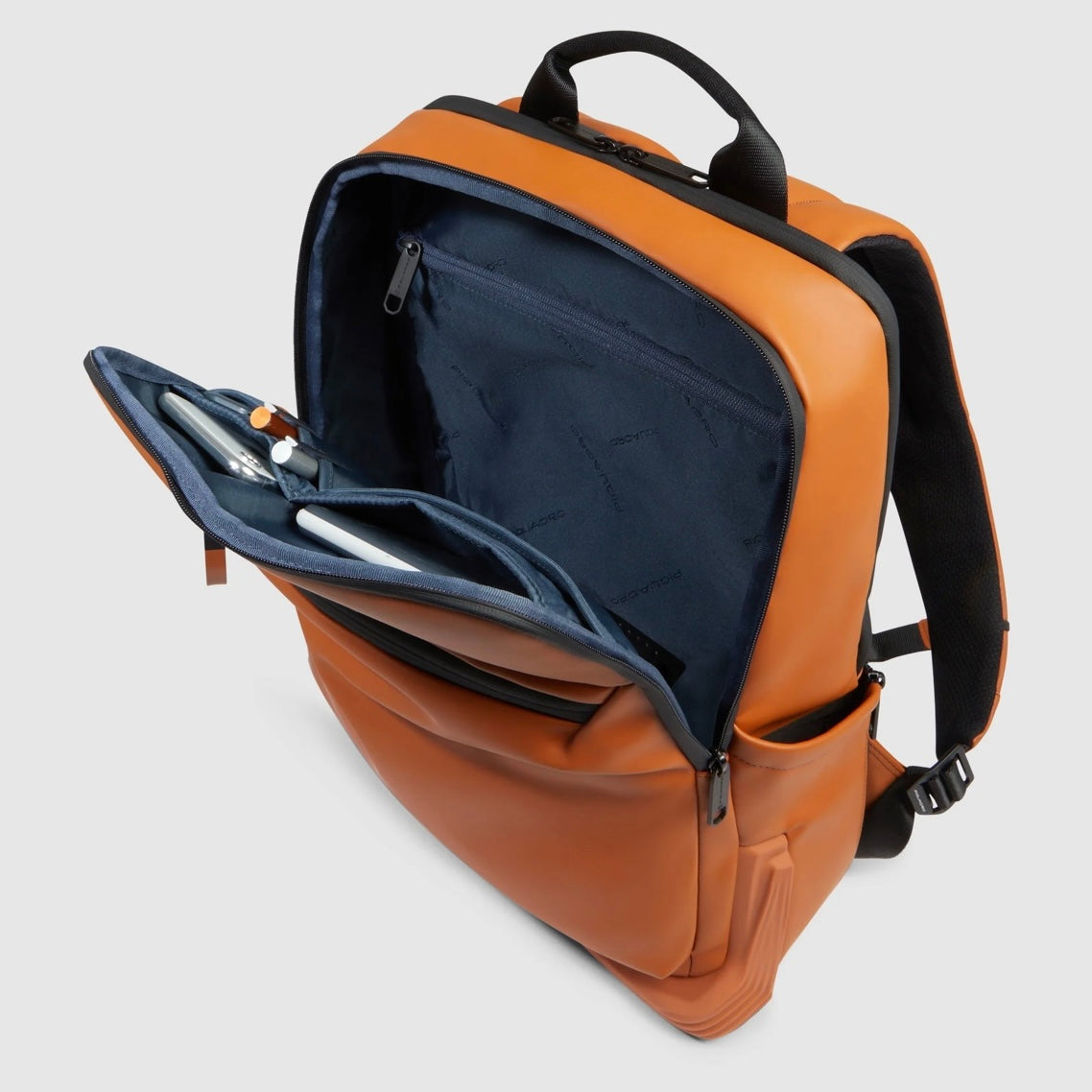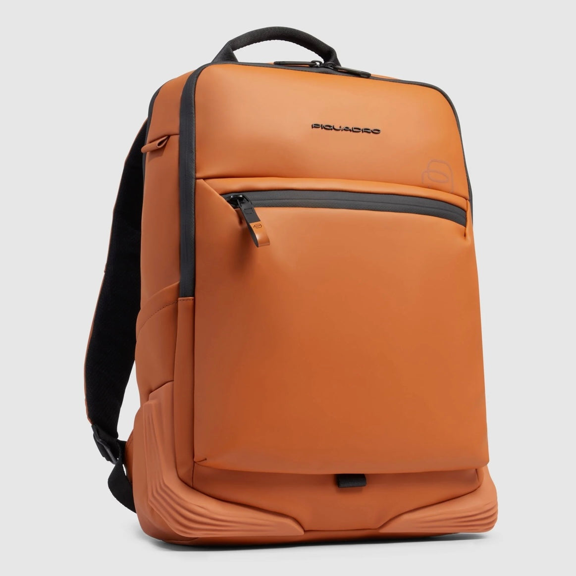 Da Piquadro, uno zaino in tessuto gommato resistente all'acqua. Dotato di due scomparti di cui uno è rinforzato anti-urto per alloggiare un pc da 15,6".