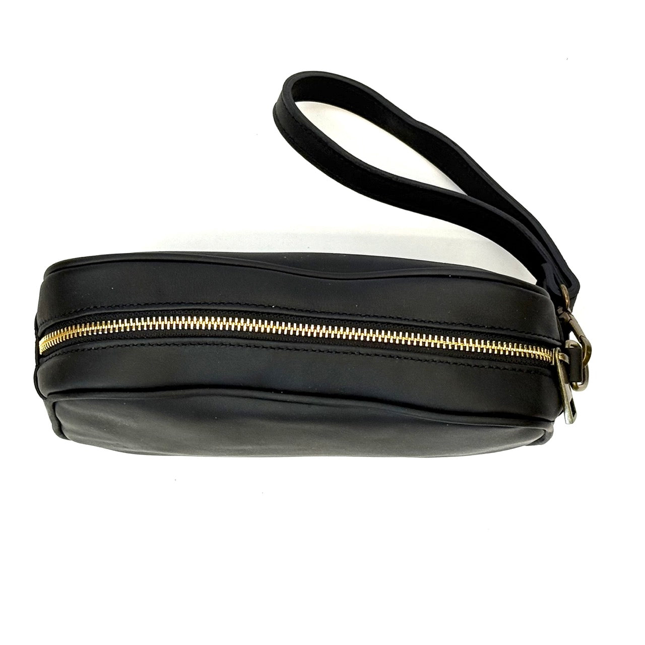 Pochette maschile in pelle dalla texture morbida in colore nero con polsiera staccabile.