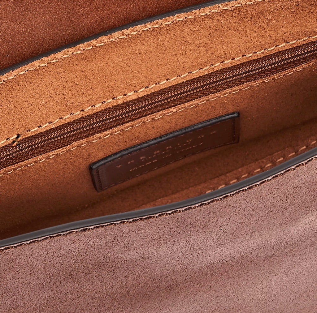Interno foderato in pelle scamosciata completo di due tasche porta oggetti. Metalleria: ottone