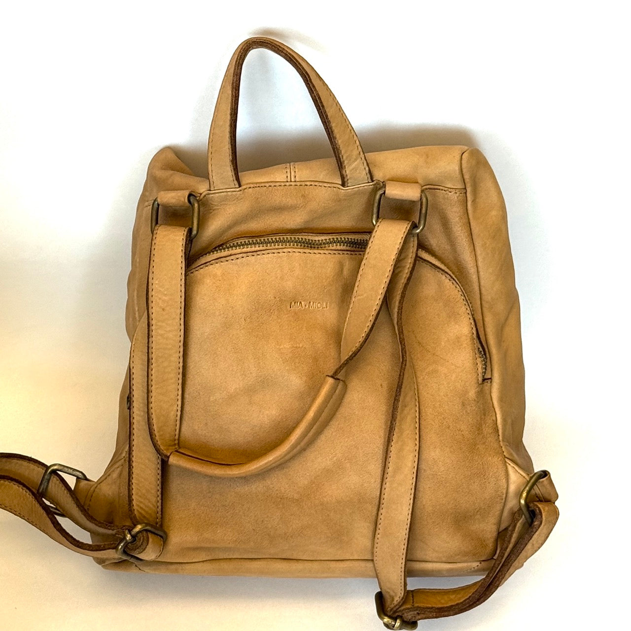 Zainetto in morbida pelle dal trattamento vintage con apertura sul retro antifurto. Dotato di due comode tasche laterali chiuse con zip.